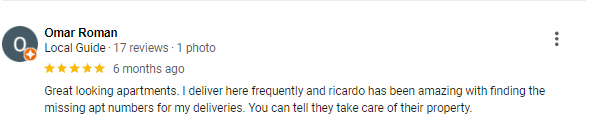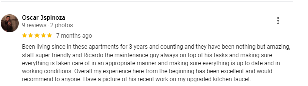 Ruth and Dairon will ensure that your new apartment is ready for you to move in and take care of all the details to guarantee that you are happy with your new apartment. Dairon also makes sure to keep our community clean and looking beautiful. Ruth will ensure that after you move in all our pest control needs, and valet trash needs are met. Did I mention we have free valet trash service & pest control?