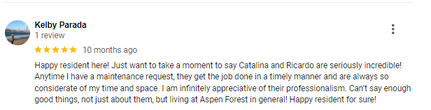 Once you move in, you will notice that Catalina and Ricardo work together to take care of any repairs that may arise in your unit, and they will do so with a smile! Catalina understands the importance of promptly addressing your requests, while Ricardo ensures that everything is done correctly, always with a big smile on his face. We take great pride in our exceptional maintenance response times, and we are committed to providing you with phenomenal service.