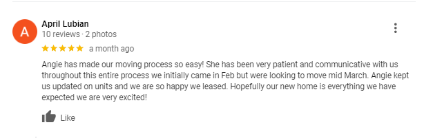 As soon as you walk into the leasing office, Angie, our leasing agent, will greet you warmly. She is amazing at her job and will make your application and moving experience a dream come true! The whole team, including Angie, is committed to providing you with fantastic customer service. They understand the stress and hassle of moving into a new apartment and will do their best to make it as smooth as possible for you.